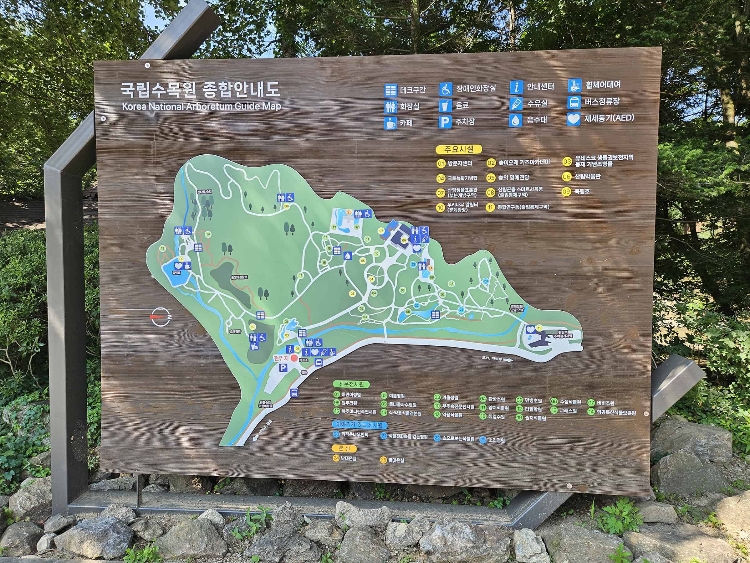 수목원 입구에 도착했을 때, 바로 느껴지는 건 짙은 녹색의 숲 향기예요. 문을 지나자마자 밀려오는 나뭇잎 냄새와 상쾌한 공기가 도심의 피로를 싹 잊게 하더라고요. 입구에서는 안내 지도를 제공받는데, 광활한 수목원의 다양한 테마 전시원과 산책로가 그려져 있어서 동선 짜기에도 편리했어요.
