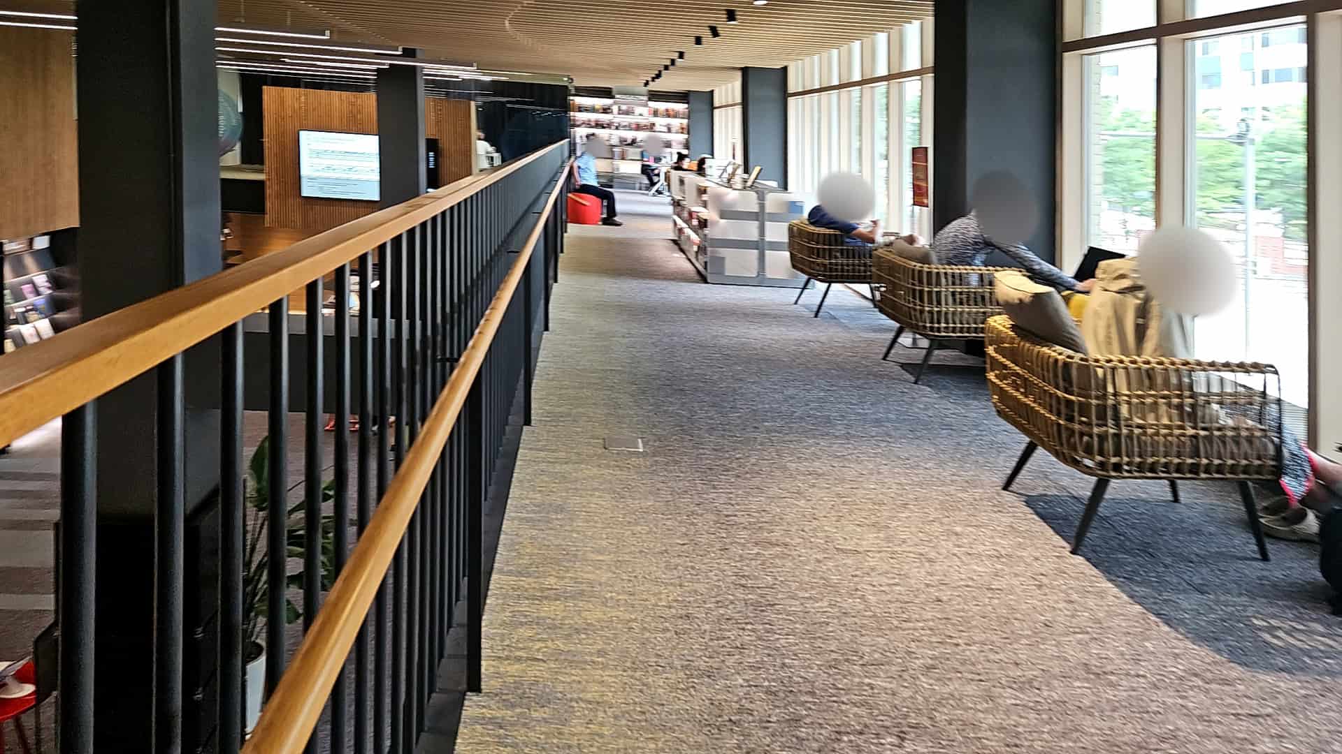제가 제일 오래 머물렀던 곳은 바로 2층이에요. 이곳에서는 창밖으로 보이는 공원의 멋진 뷰를 배경으로 소파에 앉아 여유를 즐길 수 있어요.