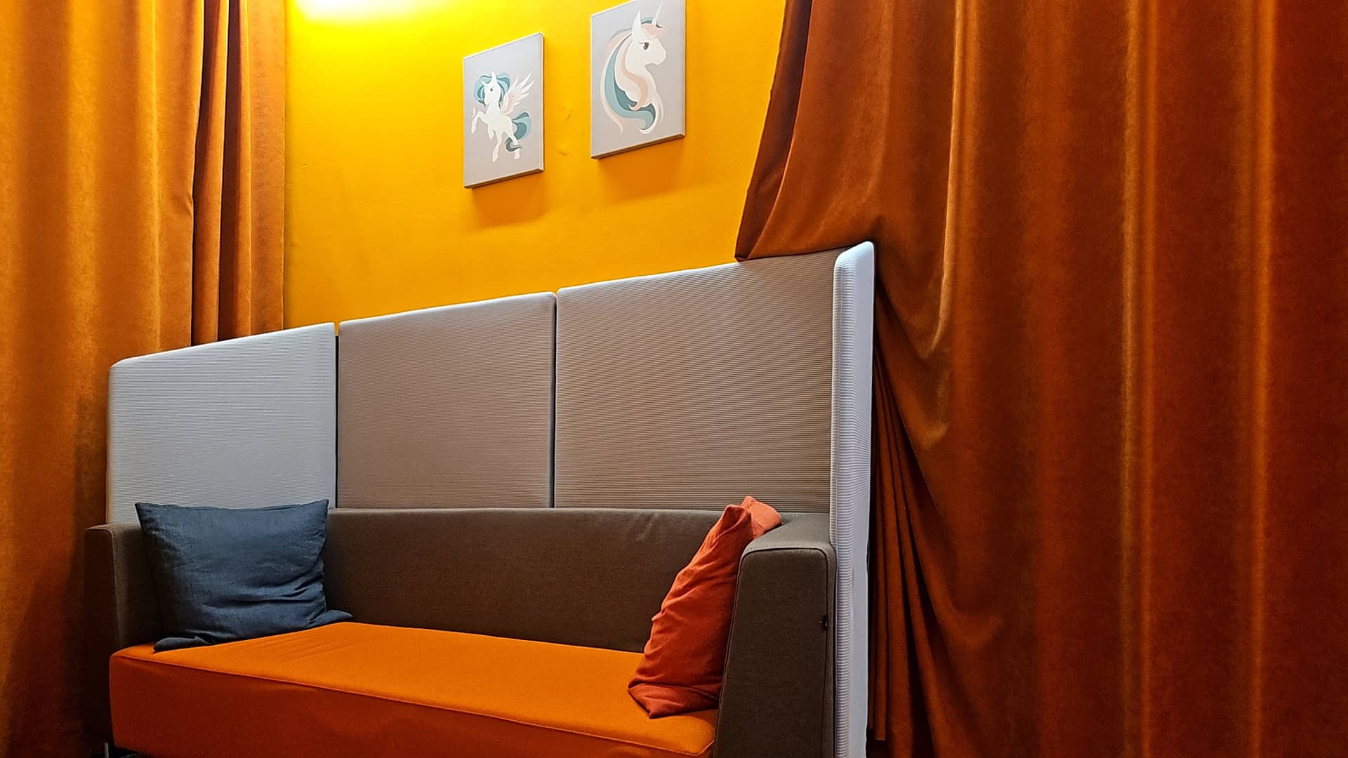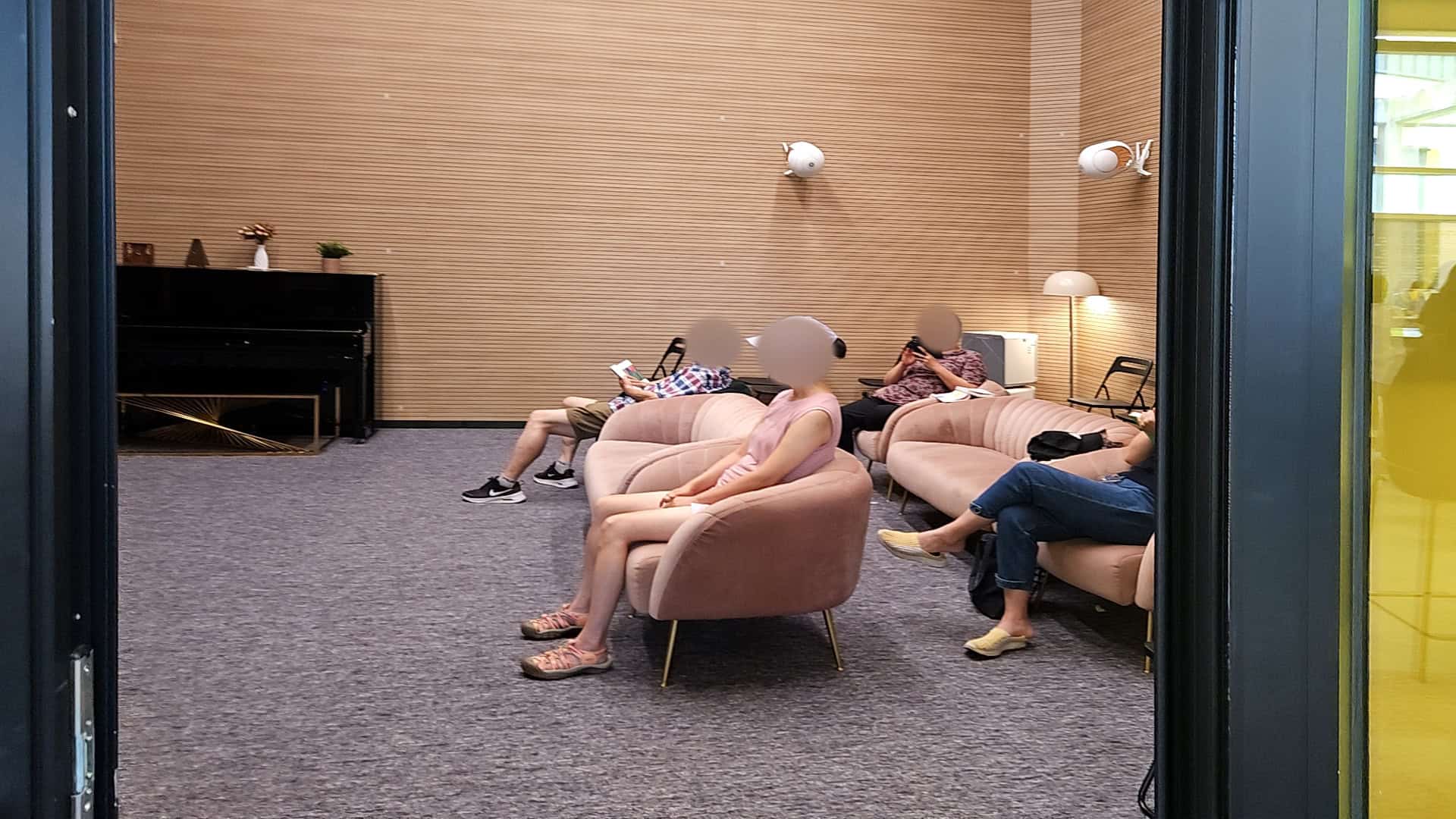 제가 제일 오래 머물렀던 곳은 바로 2층이에요. 이곳에서는 창밖으로 보이는 공원의 멋진 뷰를 배경으로 소파에 앉아 여유를 즐길 수 있어요.