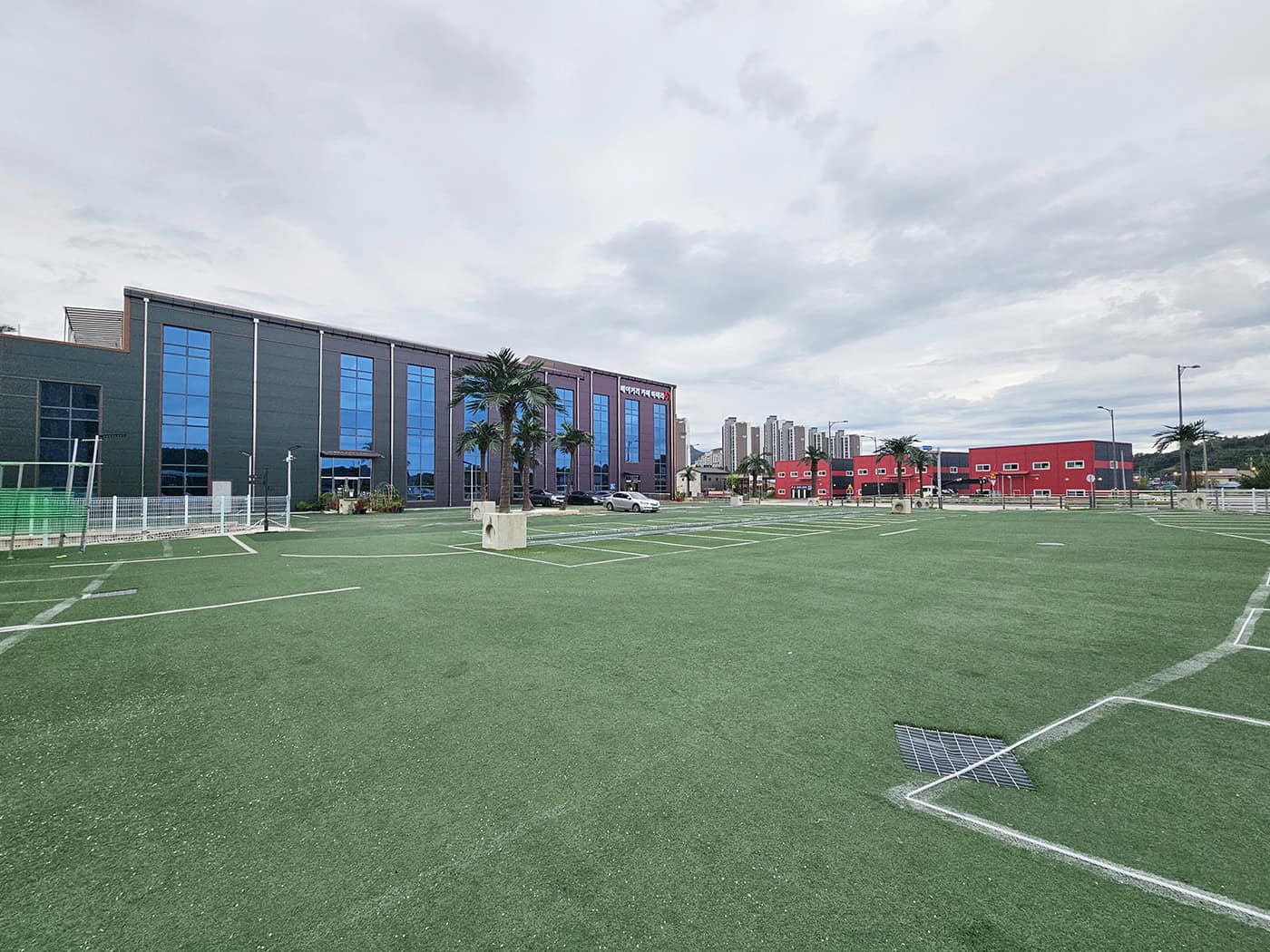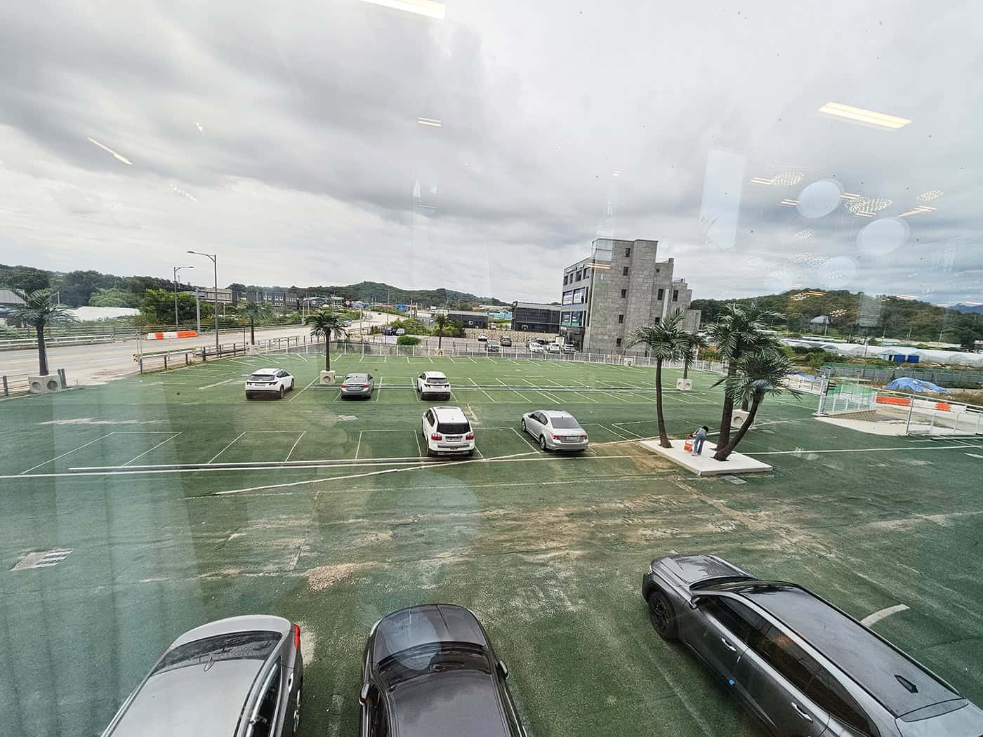 건물 앞에 도착하자마자 탁 트인 마당과 야자수 데코가 눈에 확! 들어왔어요. 외관은 깔끔한 직선미, 내부는 열대 식물원같은 느낌의 대형 카페라는 말이 바로 이해될 정도였죠.
