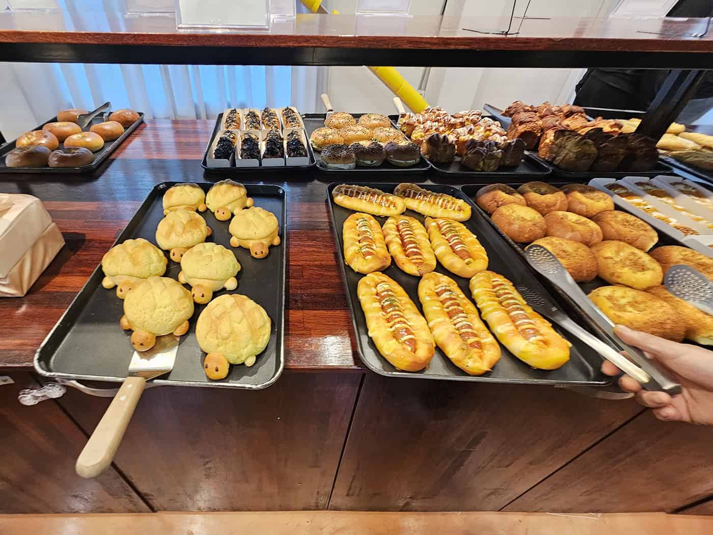 이곳의 하이라이트는 역시 빵 진열대. 갓 구운 페이스트리 향이 퍼지는 쪽으로 발길이 저절로 향했어요. 저희가 오늘 즐길 빵으로 치이바타, 밤페스츄리, 크림크루아상, 시나몬 크런치 를 골랐답니다.