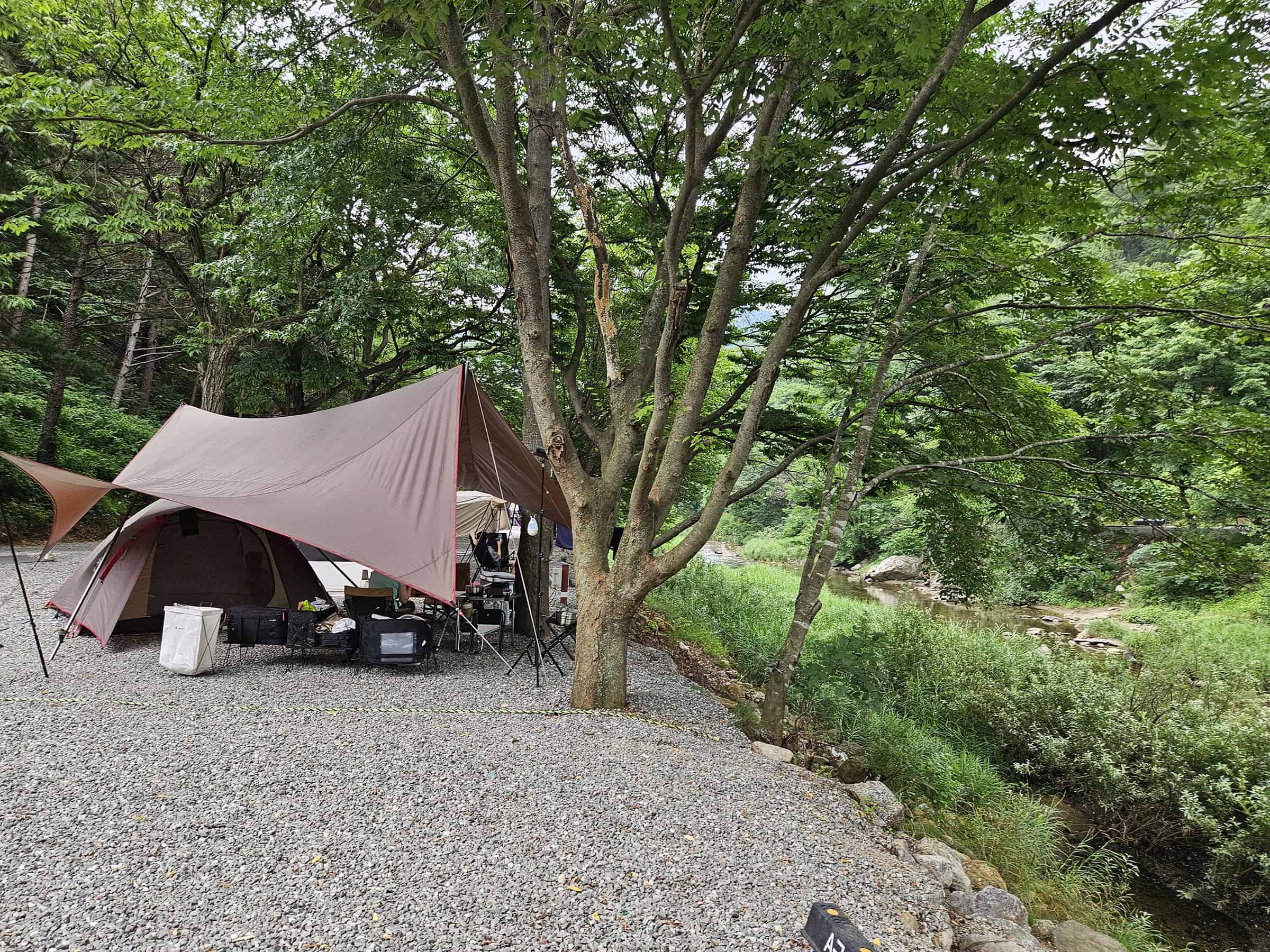 계곡물은 굉장히 맑고 차가워서, 보는 것만으로도 시원한 느낌! 주변엔 푸릇한 나무들이 드리워져 있어서 그늘도 완벽했죠. 그리고 캠핑 구역은 잘 정돈되어 있어서 어디 무질서하거나 불편하다는 느낌 없이 딱 정리된 인상이었어요.