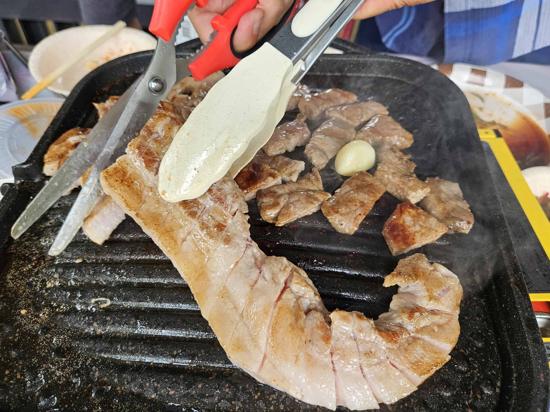 곡달계곡 오복집에서 가장 좋았던 건 야외식탁에 고기를 구우면서 계곡 물소리 듣는 순간이었어요. 동네 정육점에서 사온 신선한 고기를 올려 굽는데, 시원한 바람과 함께 캠핑의 맛이 더해지더라고요.