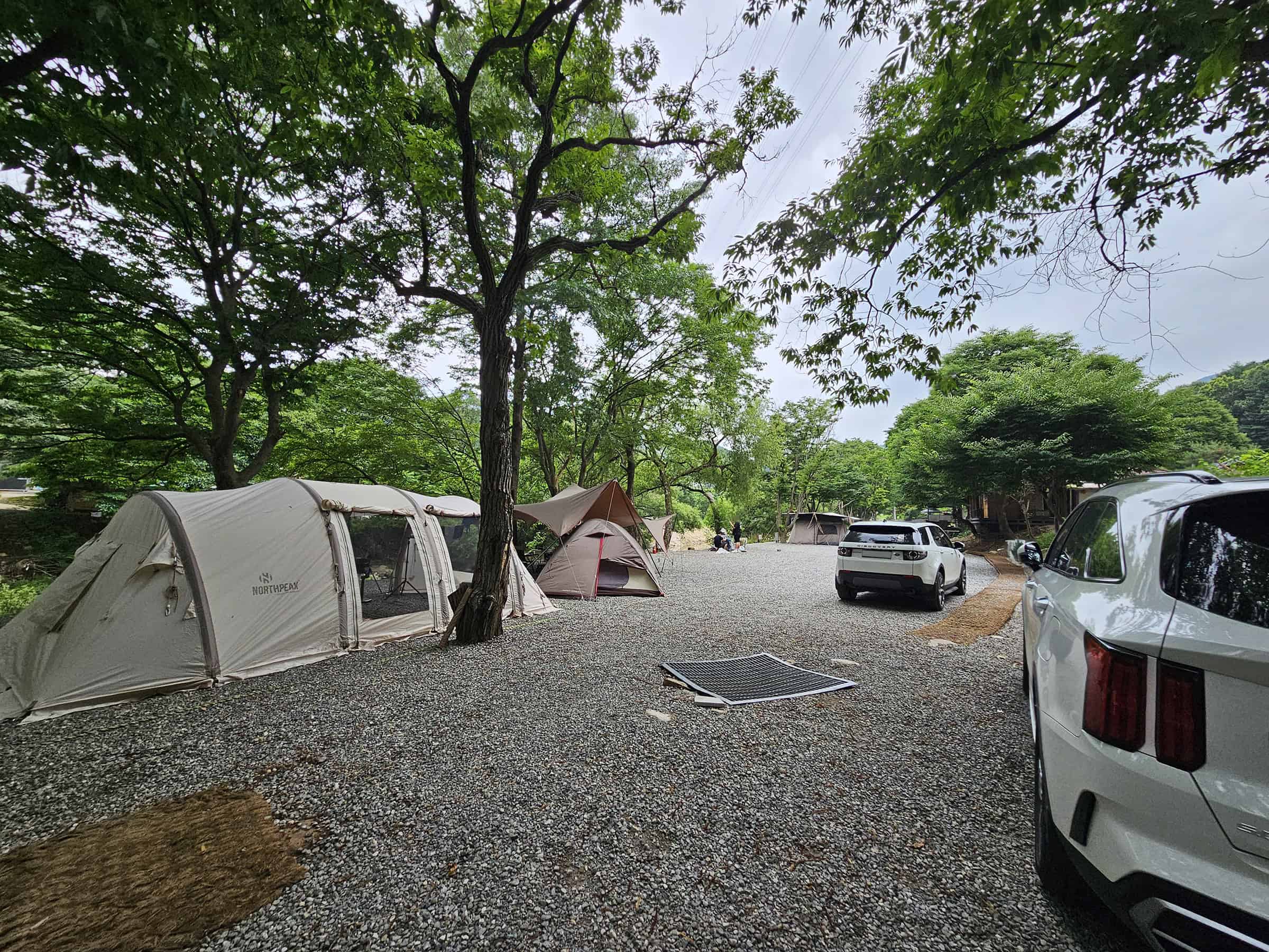 곡달계곡 오복집 온누리캠핑장에 도착하자마자 가장 눈에 띈 건 계곡 바로 옆 넓게 펼쳐진 파쇄석으로 단정하게 정비된 캠핑 구역이었어요. 여기가 사람들이 좋다고 하는 이유구나 싶더라구요.