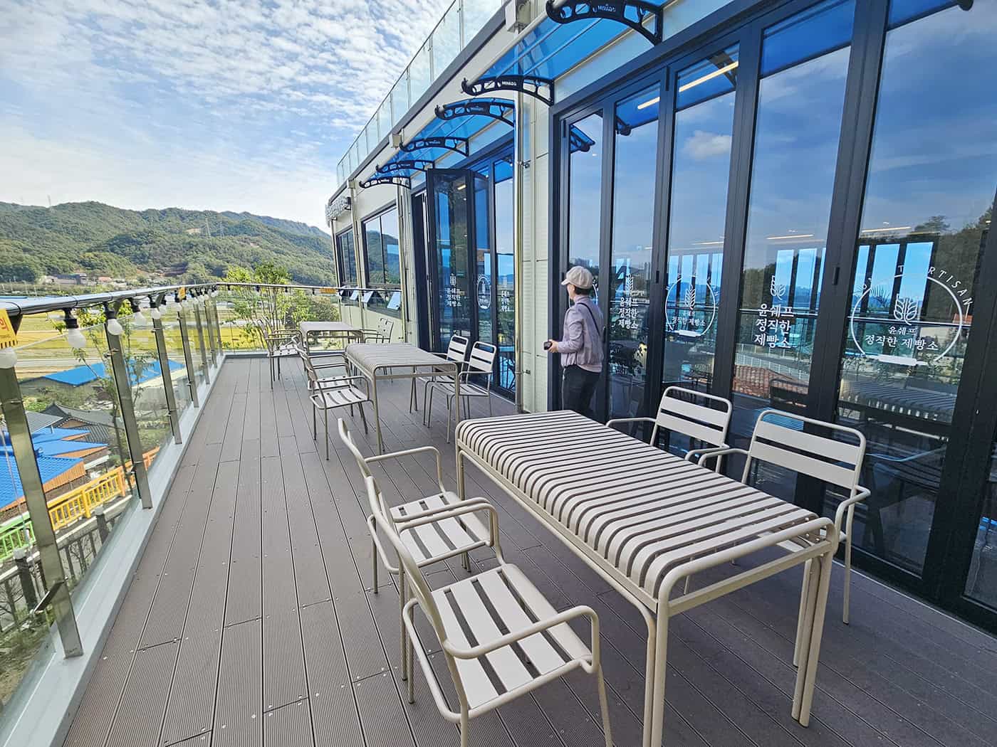 실내는 층고가 높고 창이 커서 채광이 너무나 좋았답니다. 곳곳에 유아 의자와 셀프 정수대가 마련되어 있어 편했고, 2층 테라스는 전망이 좋아 가을빛 들판을 한눈에 담을 수 있었어요.