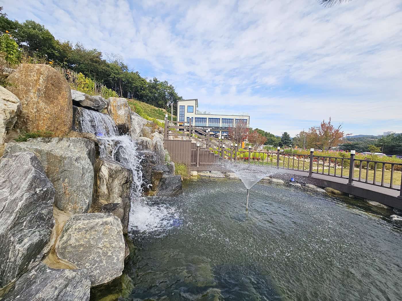 건물 앞부터 깔끔한 외벽과 전면 테라스가 반겨줍니다. 뒤편으로는 후면 테라스와 넓은 들판이 보여서 경치가 아름답고요. 이곳의 특징은 인공폭포, 산책로가 이어져 있어 사진 찍기도 너무나 좋아요.
