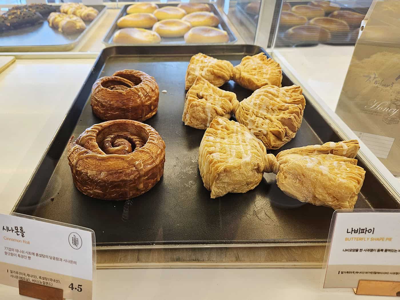 입구에서 트레이와 집게를 챙기고 섬형 진열대를 천천히 돌면 됩니다. 윤쉐프 정직한 제빵소는 빵 종류가 폭넓어요. 우리 쌀 소금빵, 데니쉬 밤식빵, 버터 크루아상, 슈크림빵, 월넛 허니브레드, 연유바게트, 수제 단팥빵 등 선택지가 넉넉합니다.