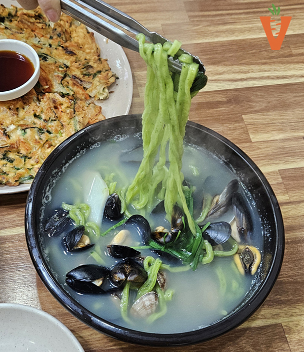 해물칼국수는 신선한 시금치를 갈아 넣어서