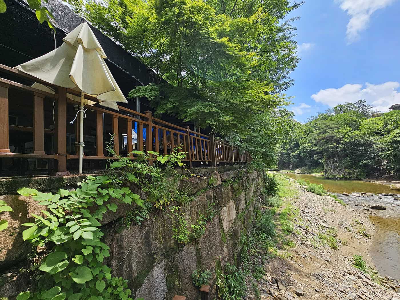 이곳의 진짜 매력은 계곡을 바로 내려다보는 테라스예요. 파라솔 그늘이 많아 햇살 강한 시간에도 비교적 편했고, 물 흐르는 소리가 마음을 가라앉혀줘서 오래 앉아 있게 만들더라고요.