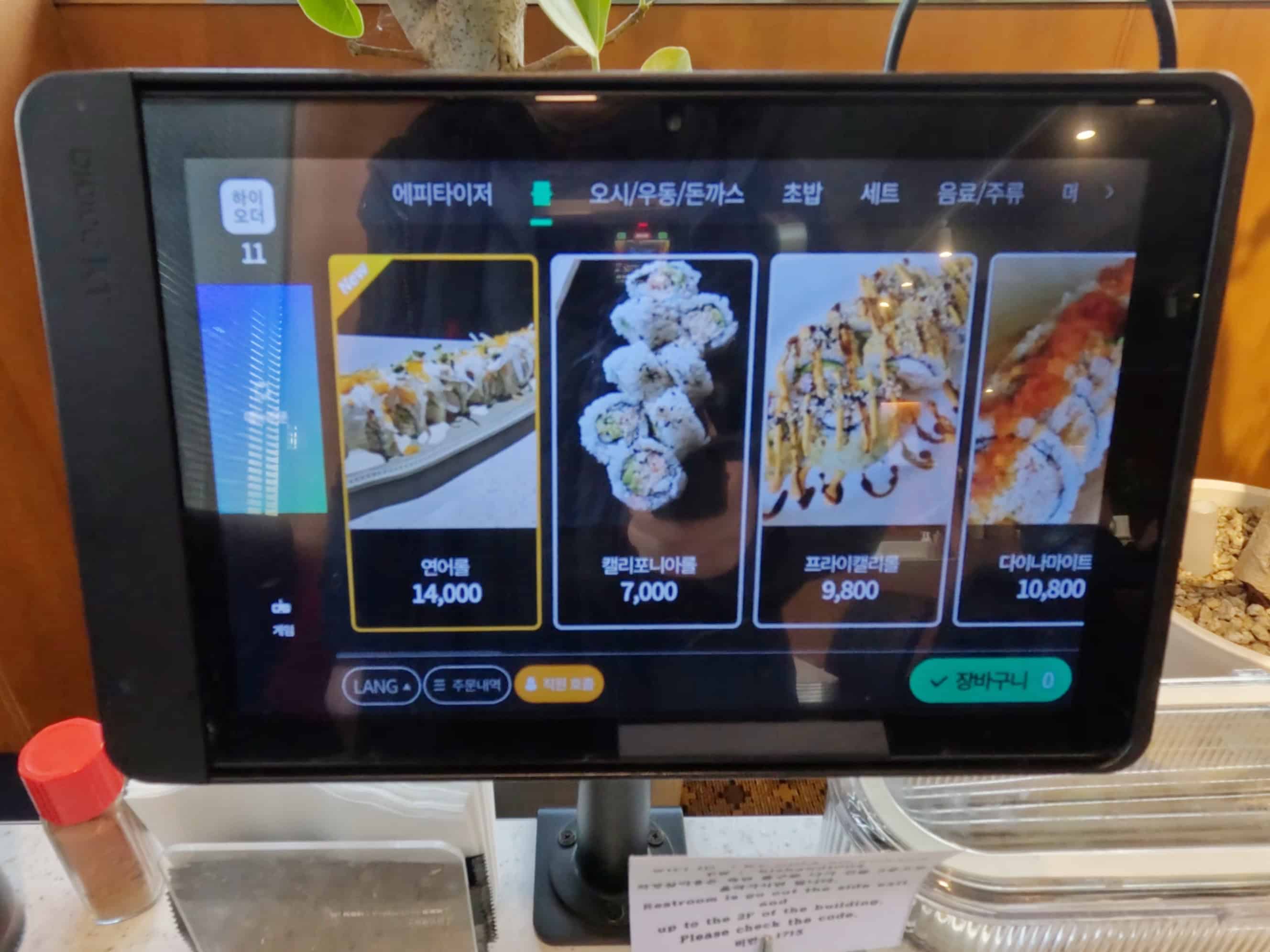 테이블마다 태블릿이 있어 메뉴 고르기 수월했답니다. 이 집은 캘리포니아 롤, 시그니처 롤, 모둠 초밥이 특히 인기. 롤은 아보카도, 크림치즈, 새우튀김이 알차게 들어가 비주얼이 화려해요.