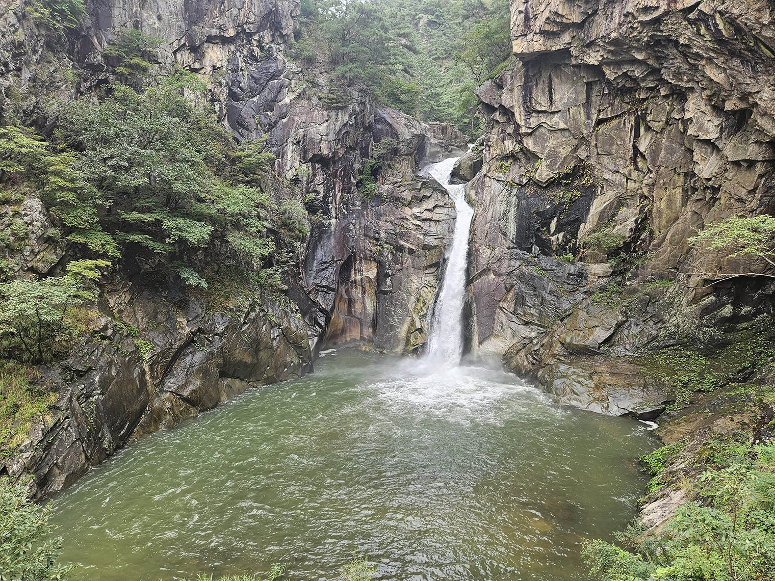 철원 삼부연폭포에 도착하자마자 들린 건 폭포수 소리가 아닌가 싶어요. 삼부연폭포는 세 번에 걸쳐 물줄기가 떨어지는 독특한 모습이 특징인데요, 높고 가파른 화강암 절벽을 따라 떨어지는 물줄기가 정말 압도적이었어요.
