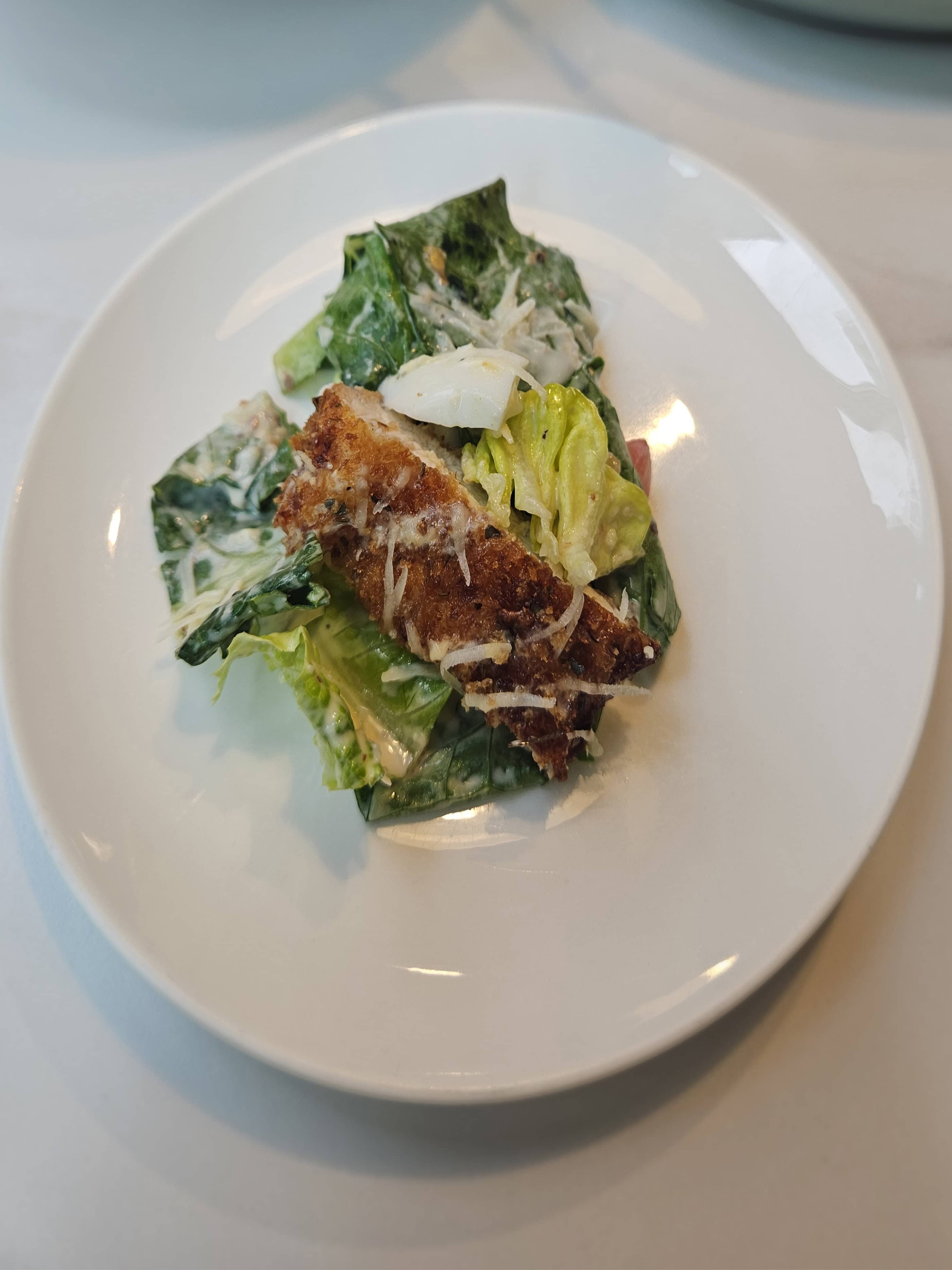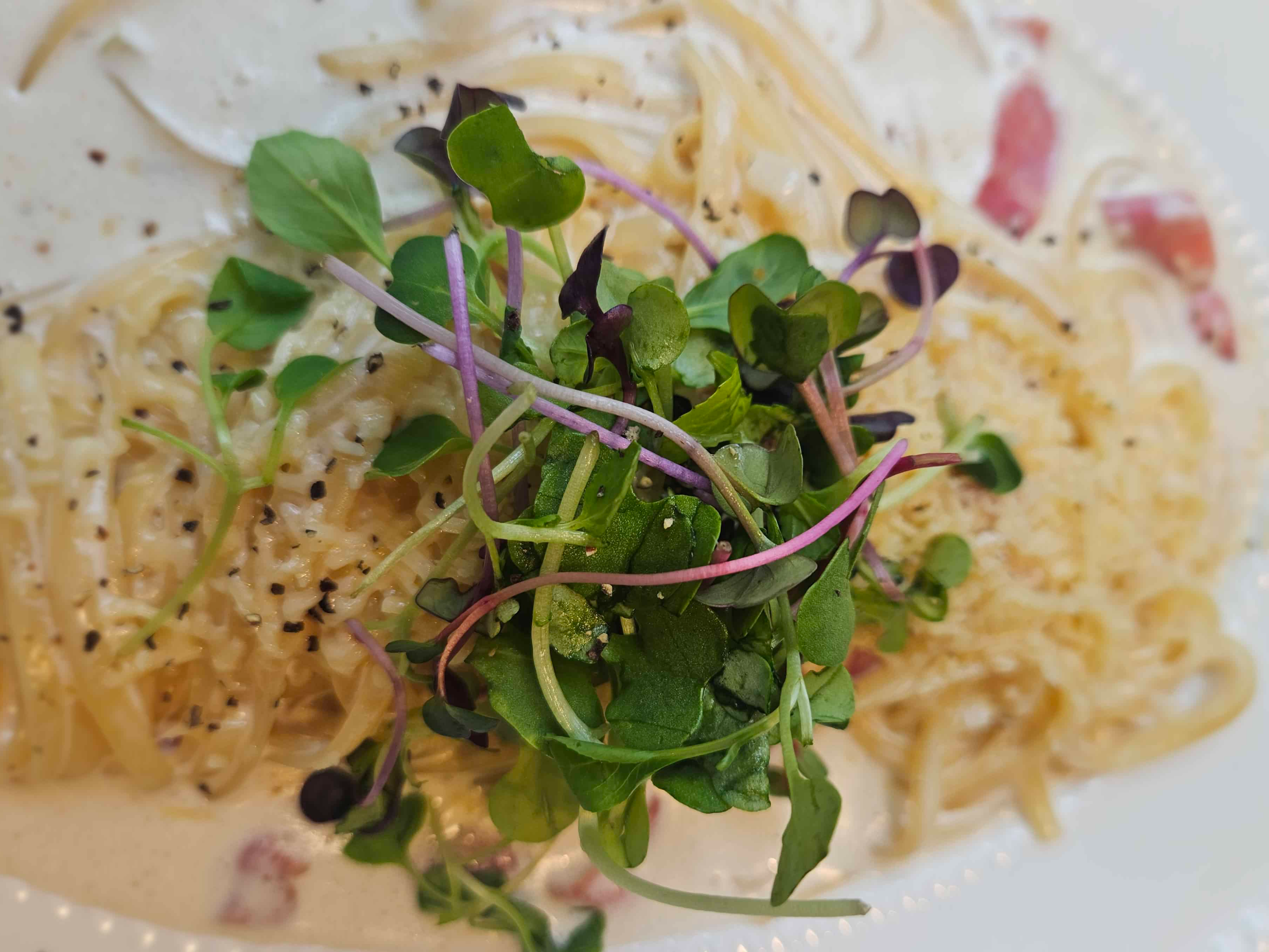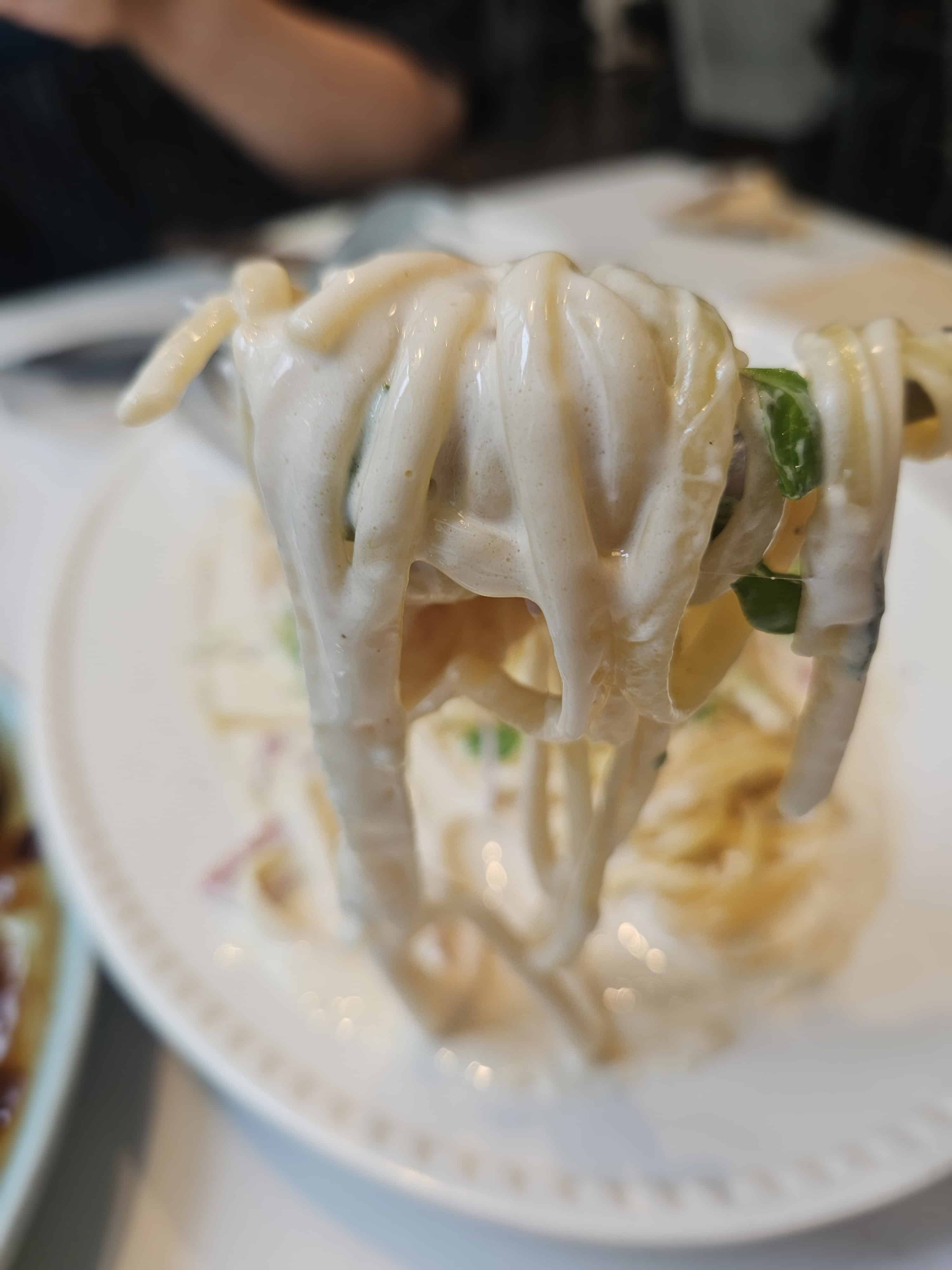 먼저, 치킨 시저 샐러드가 나왔는데요, 신선한 채소 위에 통통한 치킨과 크루통이 올려져 있었어요. 고소한 드레싱이 채소와 정말 찰떡이더라고요. 곧이어 나온 베이컨 까르보나라는 크리미하면서도 느끼하지 않은 맛이었어요.