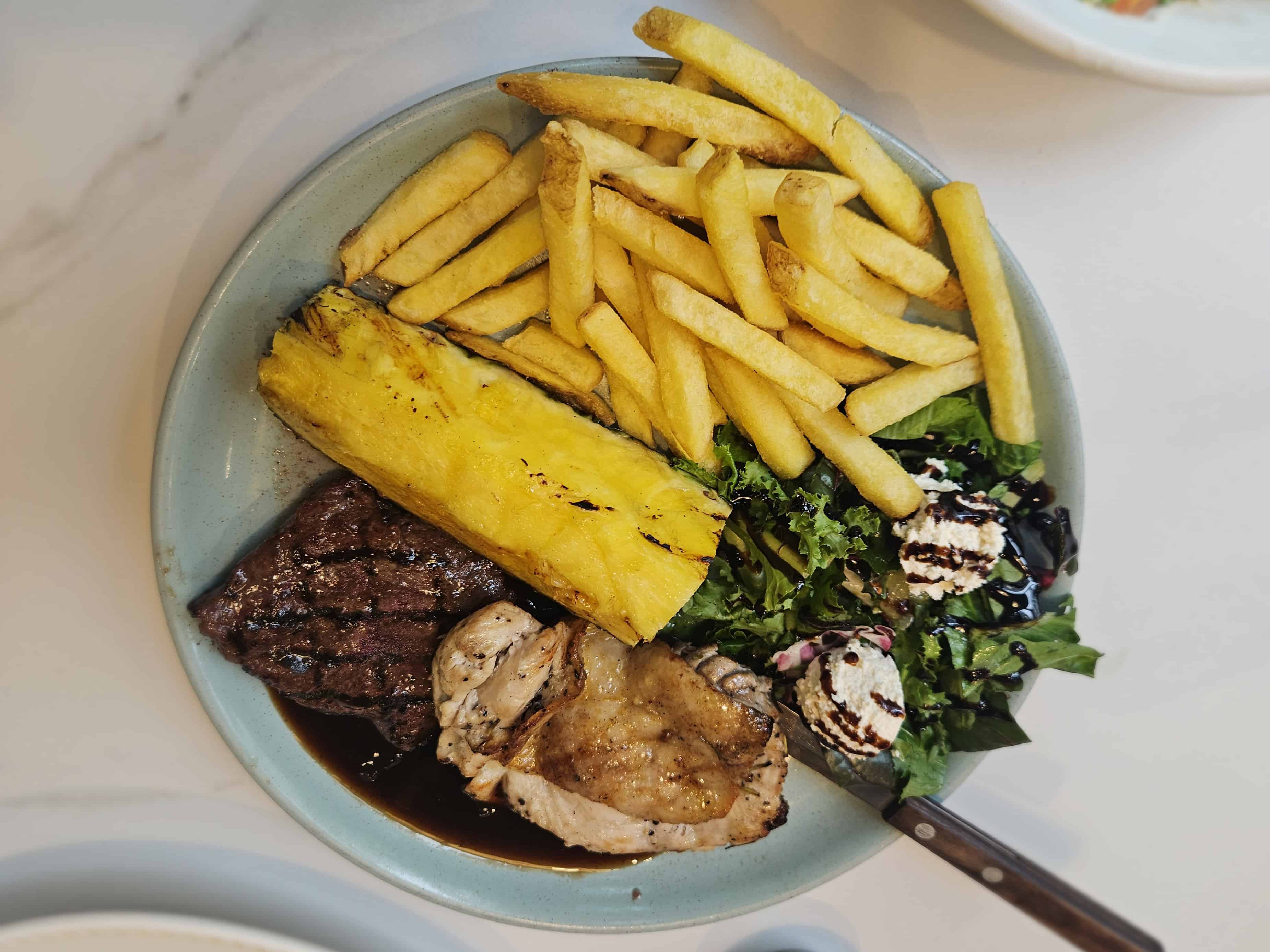 우리가 주문한 베스트 세트 메뉴는 망고 패션 아이스티, 치킨 시저 샐러드, 베이컨 까르보나라, 그리고 안창살치킨 스테이크까지 알차게 구성되어 있었어요. 진짜 이 세트 하나로 다채롭고 푸짐한 식사를 즐길 수 있었답니다.