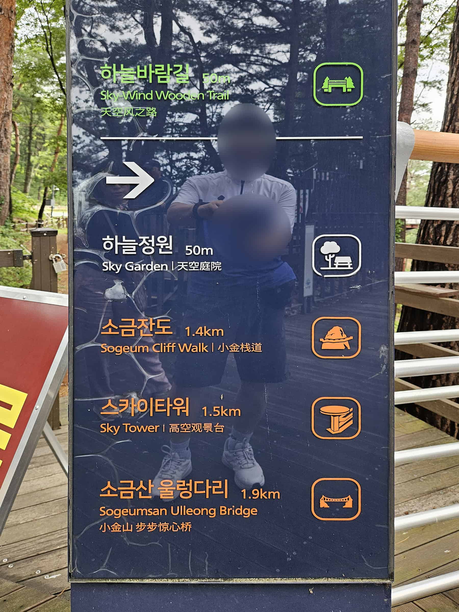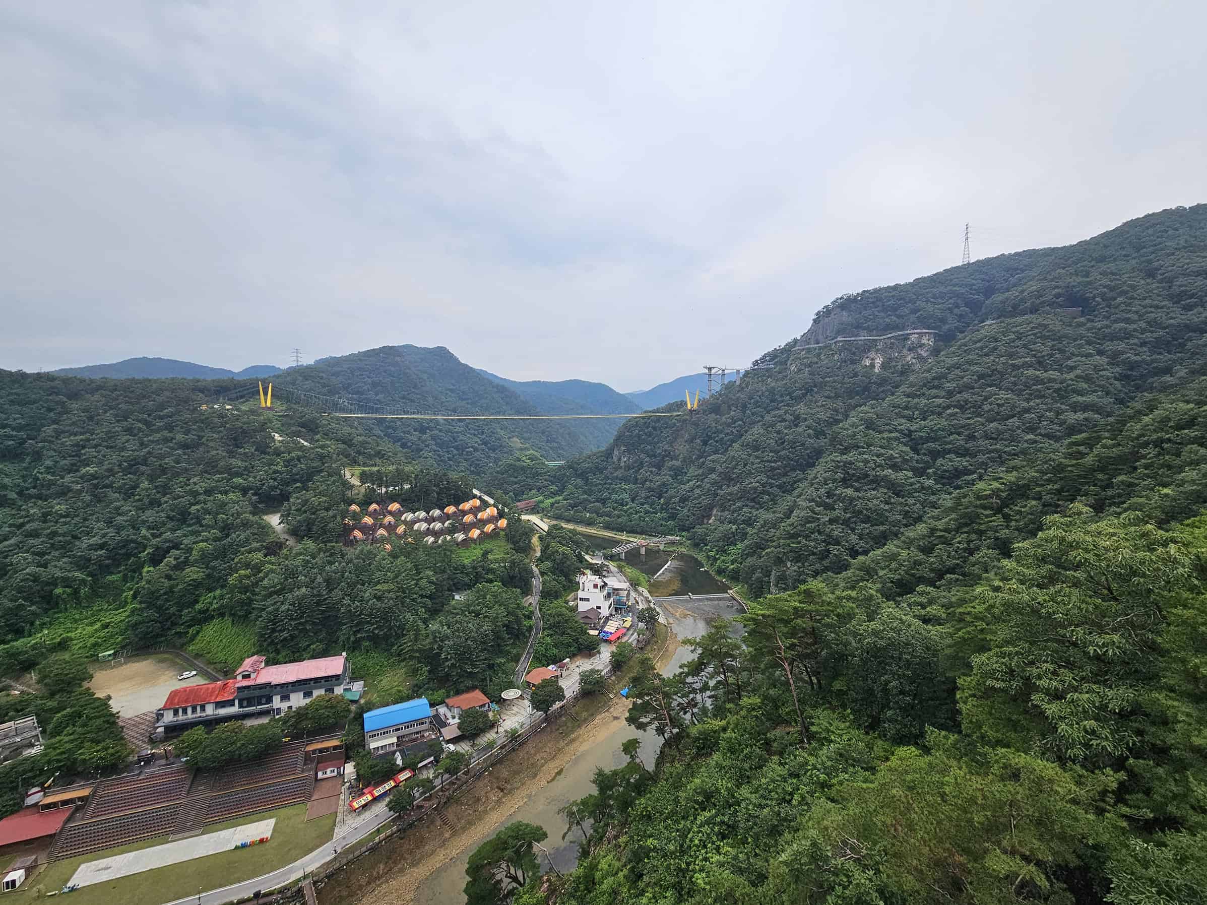 케이블카에서 내렸을 때 결정을 내려야 했습니다. 비 또 쏟아질 것 같은 느낌도 들고 뭔가 갈까 말까 고민하다가, 그래도 여기까지 왔으니 출렁다리는 꼭 건너보자며 용기를 냈어요. 입구부터 뭔가 박력이 있더라고요.