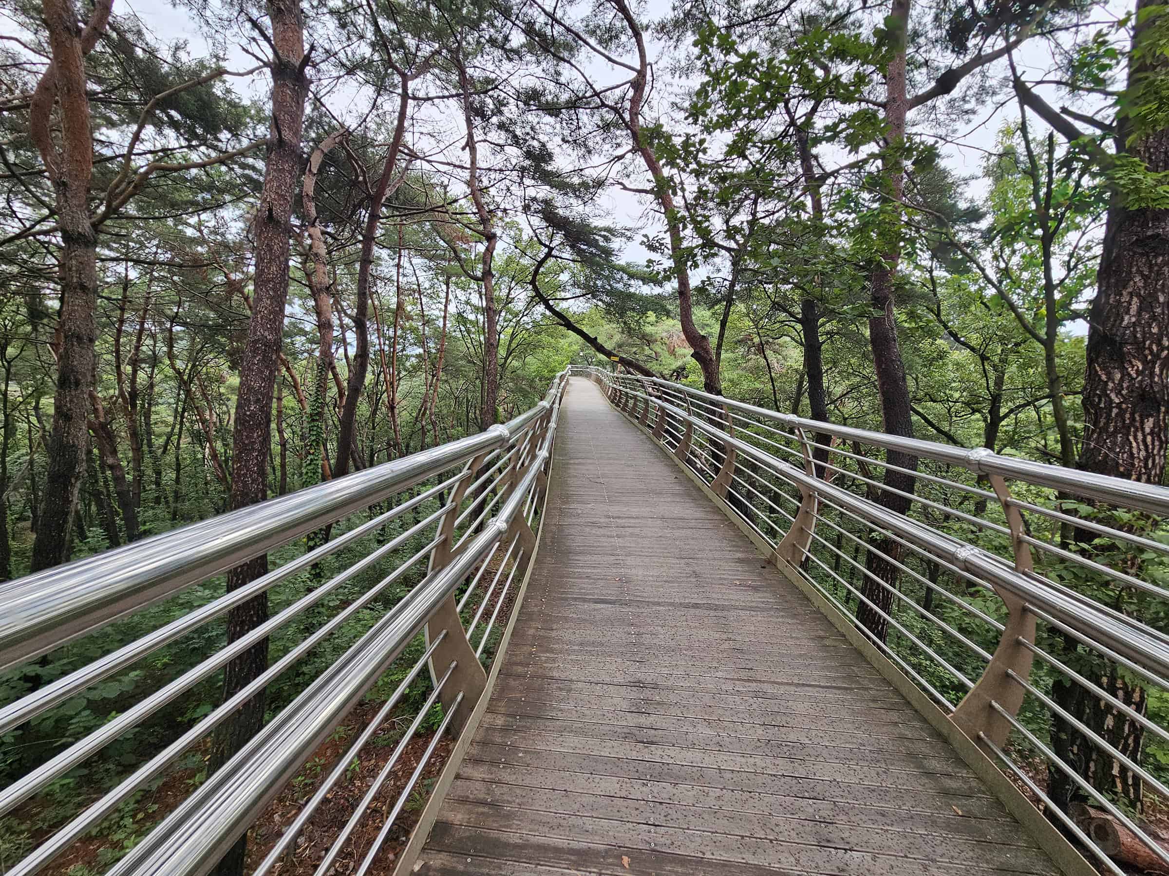 원주 소금산출렁다리의 키 큰 나무들이 우거진 데크길을 걸으며 얼굴에 부는 습기 차는 바람… 이 날씨에서는 그런대로 운치 있기도 했지만, 더울 때 비까지 내리니 몸이 힘든 건 부정할 수 없더라고요.